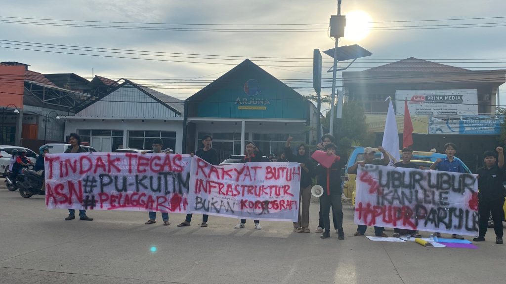 Tak hanya itu dalam aksi yang berlangsung damai ini, para demonstran membawa spanduk bertuliskan “Rakyat Butuh Infrastruktur, Bukan Koreografi” dan “Tindak Tegas ASN PU-KUTIM PELANGARAN”,